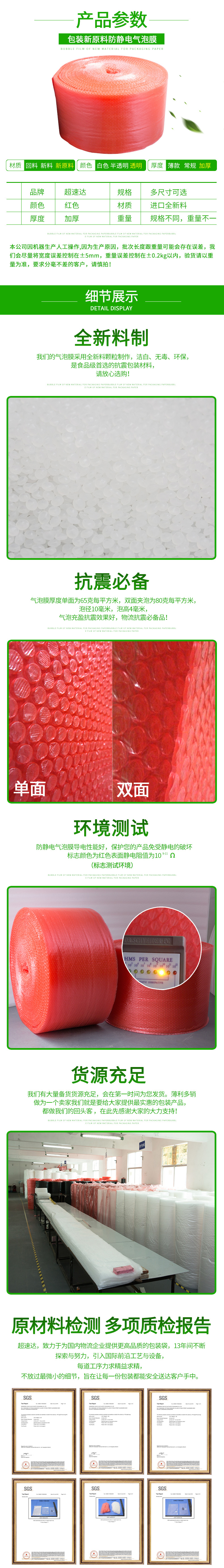 防靜電汽泡袋用于較輕產(chǎn)品和一般要求產(chǎn)品的包裝。其特性為通過(guò)這一密封氣囊達(dá)到防震緩 沖作用是一種成熟的包裝材料。防靜電氣泡袋,氣泡片可防止產(chǎn)品在生產(chǎn)搬運(yùn)過(guò)程中因碰撞, 摩擦或靜電引起的破壞。