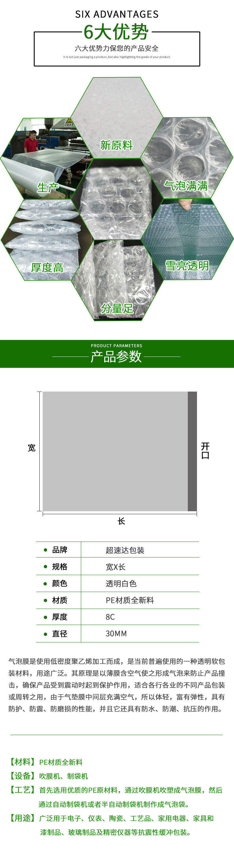 氣泡袋,又叫氣墊膜,氣珠膜,氣泡膜,氣泡紙,是采用LDPE低密度聚億烯樹脂加工而成。單面氣泡袋適宜保護自身重量較輕的產(chǎn)品。氣泡袋內(nèi)附減震氣泡膜,氣泡膜中有無數(shù)小氣泡,所以體輕,富有彈性,具有隔音,防震防、防刮擦的功能,廣泛用于電子、儀表、陶瓷、工藝品、家用電器,自車行,廚房、家具、五金工具制品、玻璃制品及精密儀器等的抗震性緩沖、保護包裝。可以防止在傳遞過程中對物品的擠壓、震動及摩擦等,對怕擠怕壓物品具有一定的保護作用。單面氣泡袋可設防靜電氣泡袋,以及不同顏色、印刷.還可復合其它材料增加保護性及美觀。主要產(chǎn)品有單面氣泡袋、雙面氣泡袋、加厚氣泡袋、紅色氣泡袋、白色氣泡袋、防靜電氣泡袋。