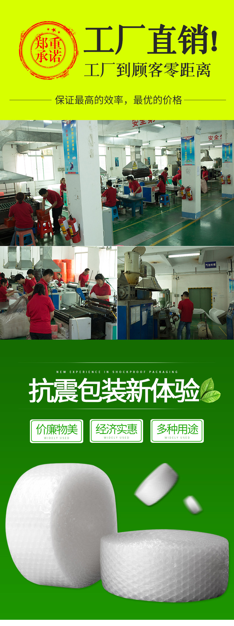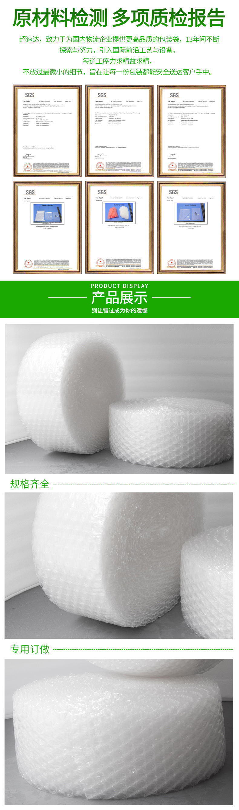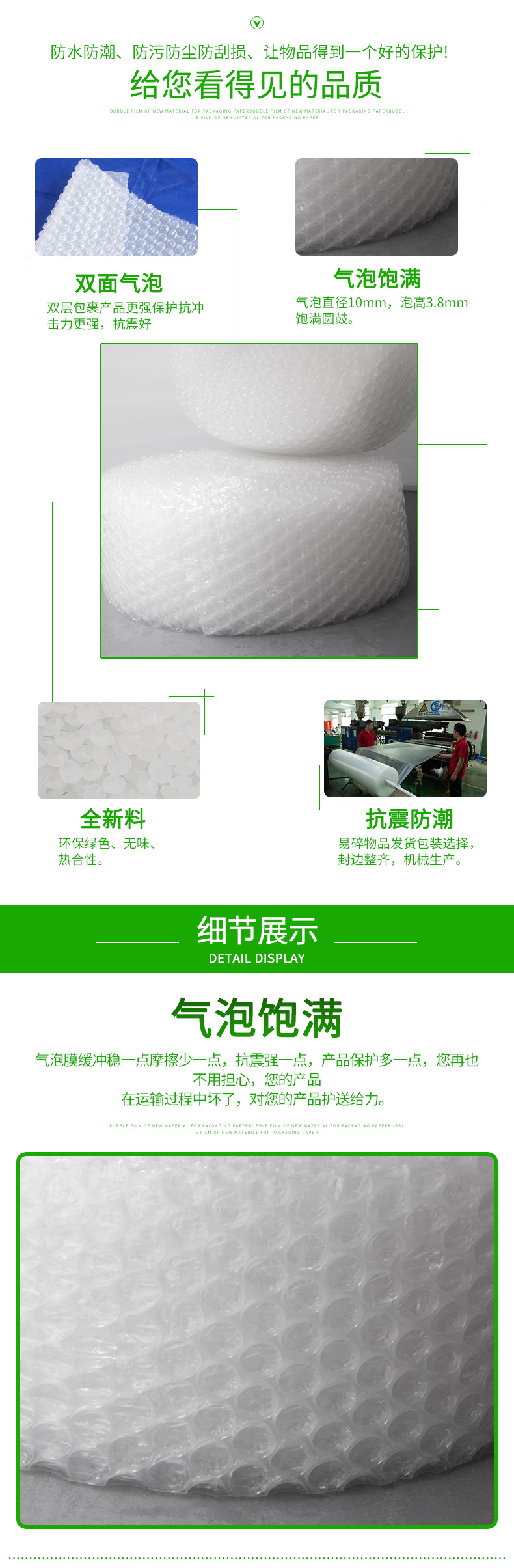 采用聚乙稀PE原料,經擠出雙層膜真空復合成型的氣墊薄膜(簡稱氣泡膜),產品主要用于儀表、儀器、易碎、易損物品的防震包裝及電子行業、食品、工藝品、五金、注塑件、日用品等行業的減震包裝,可生產單面、雙面氣泡卷材、成型袋,小泡φ5MM,普通中泡φ8MM,并可生產達 φ30MM的超大氣泡膜,可生產防靜電氣泡袋,復合多種膜料的氣泡墊,以上產品均可著色。氣泡卷、氣泡膜、單面氣泡袋、雙面氣泡袋、加厚氣泡袋、紅色氣泡袋、白色氣泡袋、防靜電氣泡袋。