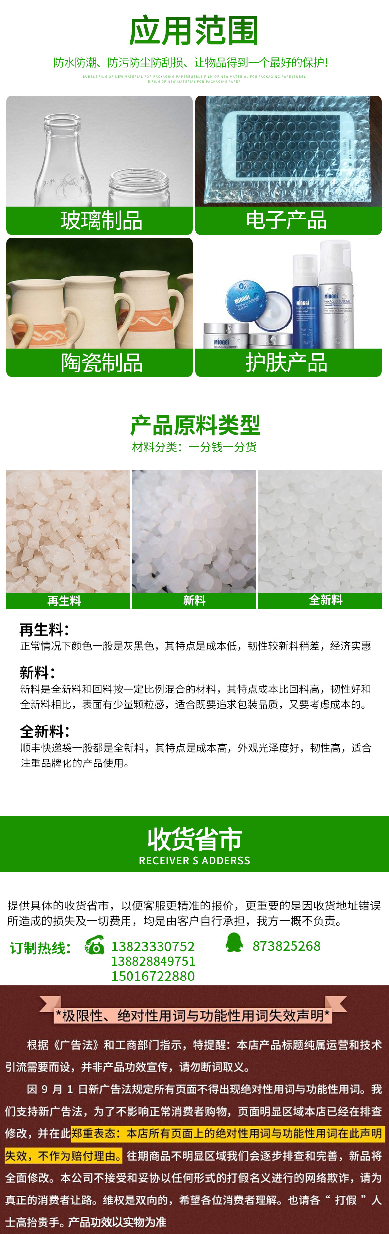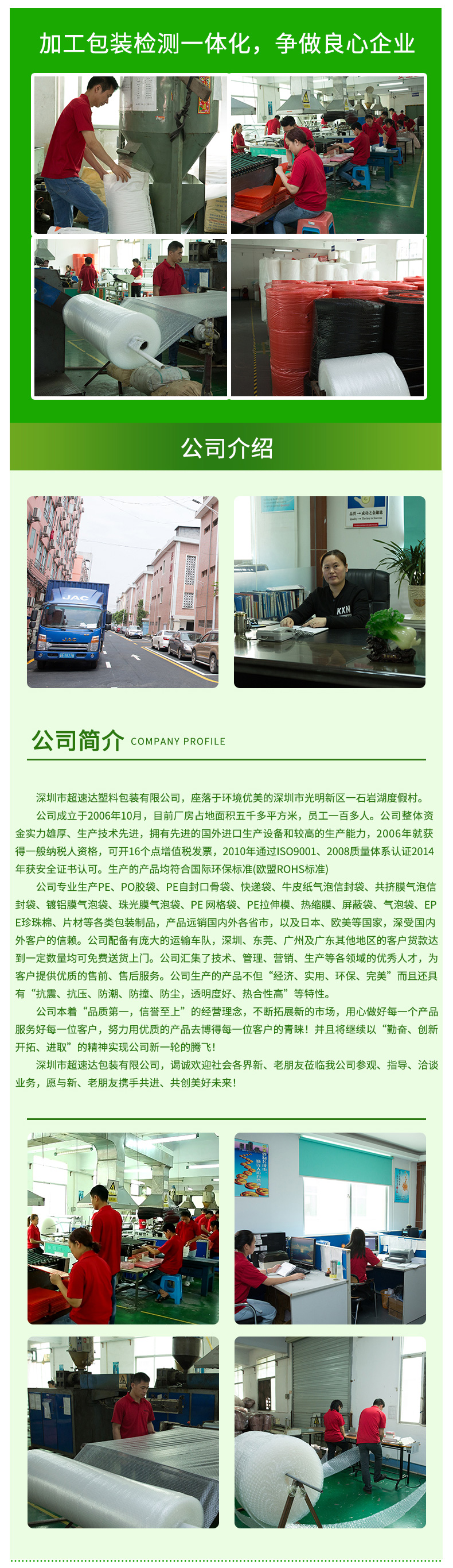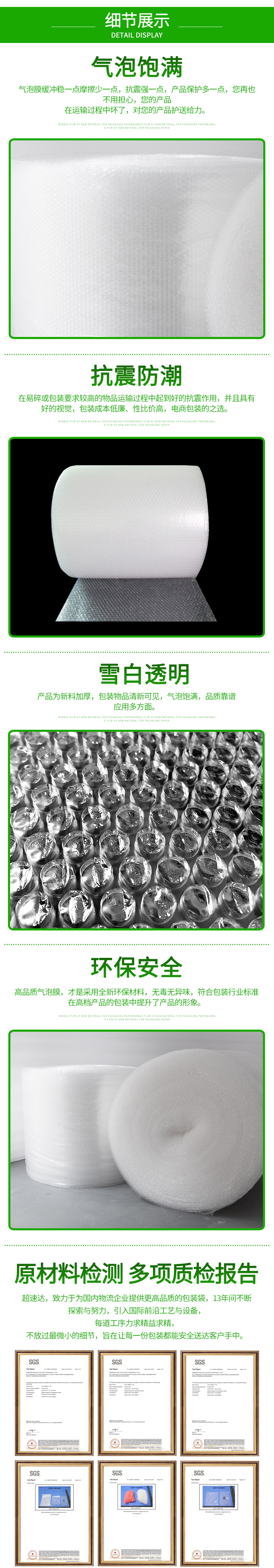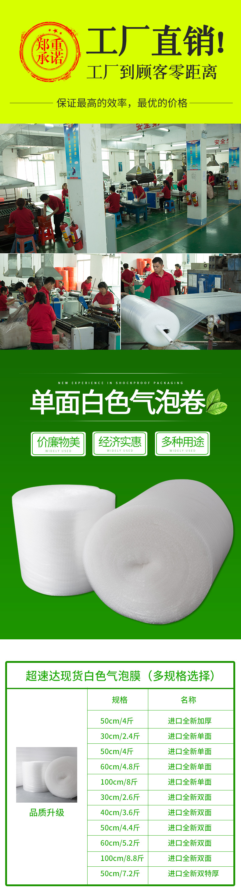 單面白色氣泡膜采用聚乙稀PE原料,單面氣泡袋適宜保護自身重量較輕的產品,產品主要用于儀表、儀器、易碎、易損物品的防震包裝及電子行業、食品、工藝品、五金、注塑件、日用品等行業的減震包裝,可生產單面、雙面氣泡卷材、成型袋,小泡φ5MM,普通中泡φ8MM,并可生產達 φ30MM的超大氣泡膜,可生產防靜電氣泡袋,復合多種膜料的氣泡墊,以上產品均可著色。氣泡卷、氣泡膜、單面氣泡袋、雙面氣泡袋、加厚氣泡袋、紅色氣泡袋、白色氣泡袋、防靜電氣泡袋。