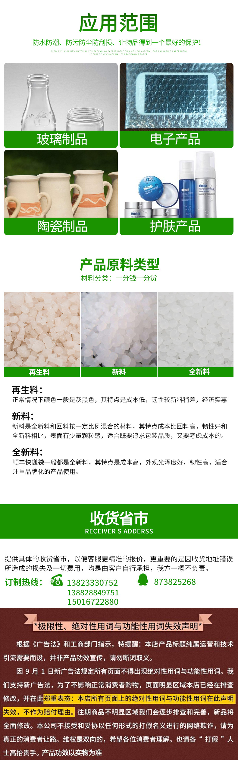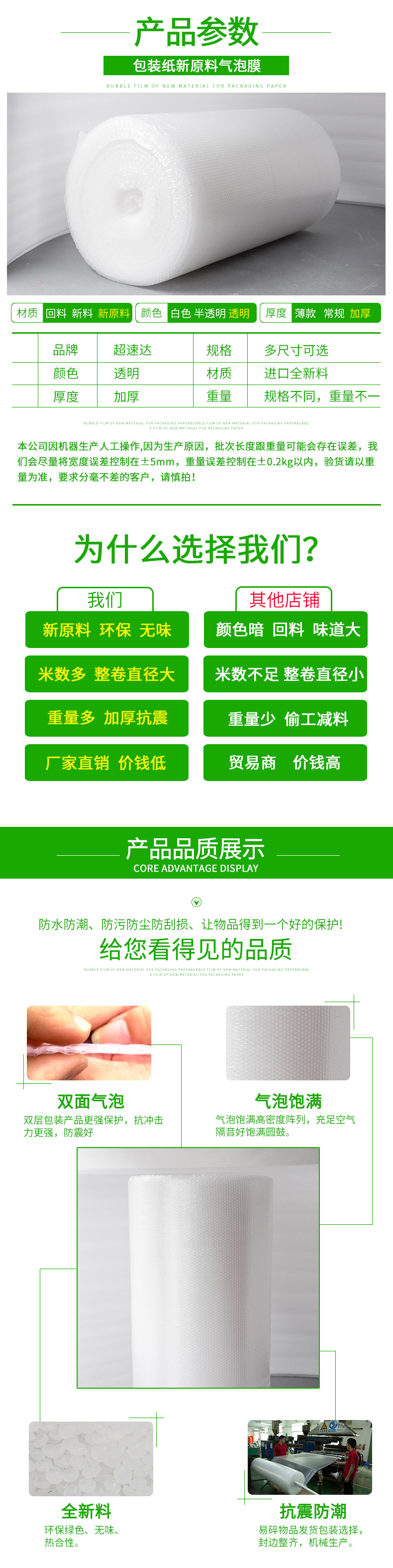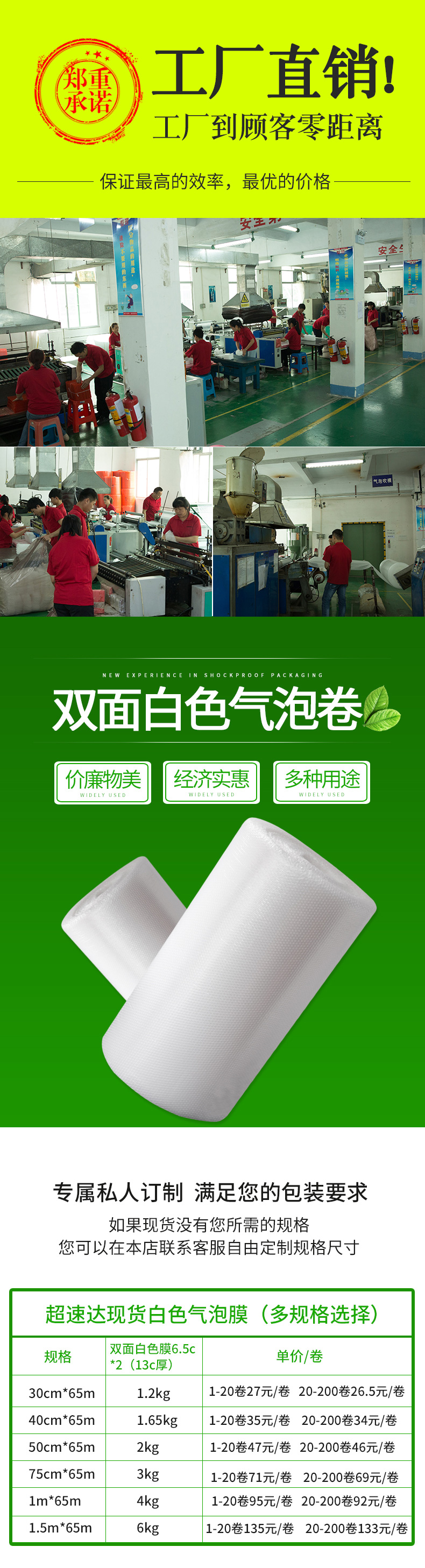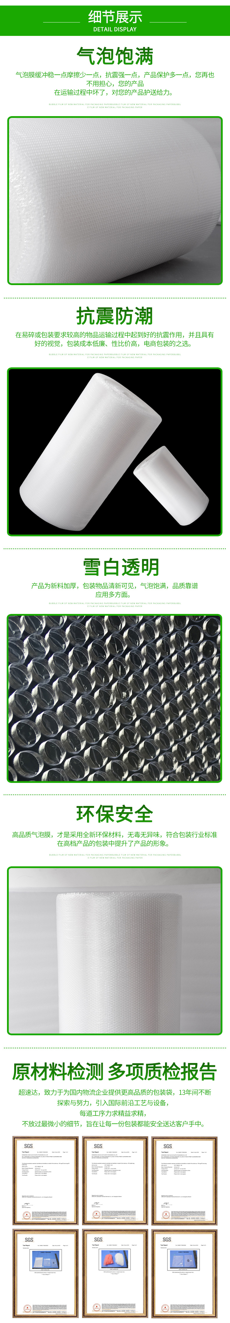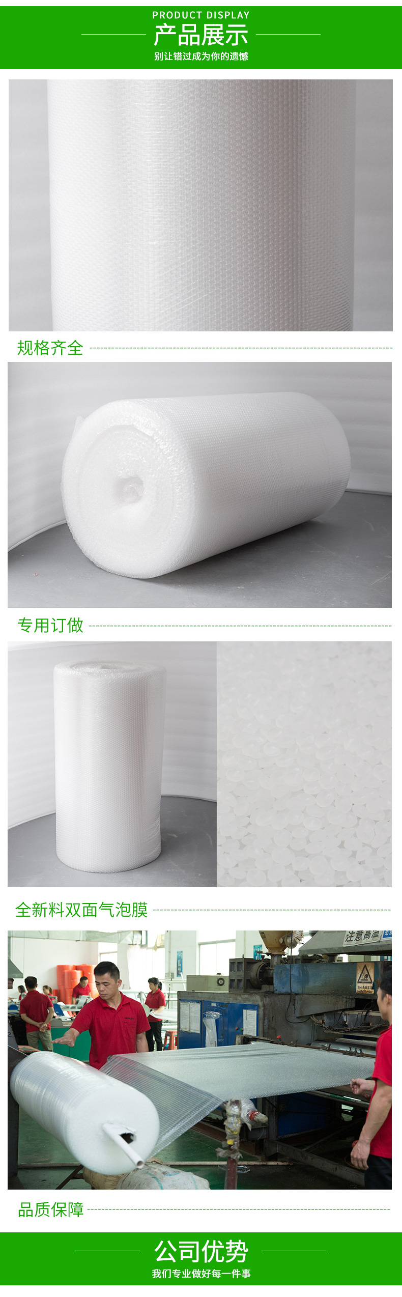 采用聚乙稀PE原料,經擠出雙層膜真空復合成型的氣墊薄膜(簡稱氣泡膜),產品主要用于儀表、儀器、易碎、易損物品的防震包裝及電子行業、食品、工藝品、五金、注塑件、日用品等行業的減震包裝,可生產單面、雙面氣泡卷材、成型袋,小泡φ5MM,普通中泡φ8MM,并可生產達 φ30MM的超大氣泡膜,可生產防靜電氣泡袋,復合多種膜料的氣泡墊,以上產品均可著色。氣泡卷、氣泡膜、單面氣泡袋、雙面氣泡袋、加厚氣泡袋、紅色氣泡袋、白色氣泡袋、防靜電氣泡袋。