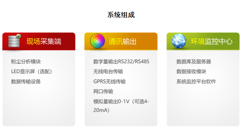 網格化空氣質量監測系統由以下部分組成:5、數據管理層:主要硬件包括工作站計算機、服務器(通信、移動或通信固定IP專線);主要軟件有操作系統軟件、數據中心軟件、數據庫軟件、城市公共場所空氣質量遠程監測系統軟件平臺(采用B/S結構,可支持廣域網瀏覽)、防火墻.