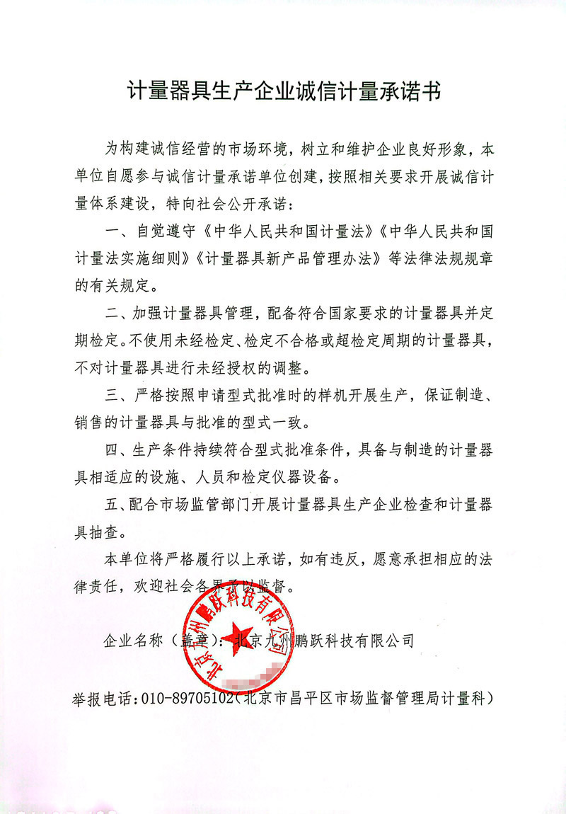 計量器具生產企業誠信計量承諾書